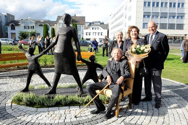 Bildet viser avdukingen av bronsjestatuen "FIRE". - Et av de siste arbeidene til Knut Steen - født på Kampen i Oslo 19.nov.1924. I store deler av sitt liv bodde han ytterst i Østerøya i Sandefjord. Fra 1976 flyttet han til Pietrasanta i Toscana i Italia. - Kanskje fordi der var store forekomster av marmor der - som han likte å jobbet med. I det nord-østlige hjørnet av Badeparken står: Mor og 2 (snart 3) barn å stirrer mot havnen i påvente av at far kommer hjem fra feltet. Skulpturen ble avduket 27.aug. 2011.( Statuen ble allerede laget mens tegningene av hvalfangstmonumentet lå på brettet. Bildet viser giverene - Bjørg og Odd Gleditch til høyre og Knut og Inger Dag Steen til venstre. Knut Steen døde en kort mnd.senere: ( 22 sept. 2011). Han var innehaver av flere italienske og Norske ordener og utmerkelser.