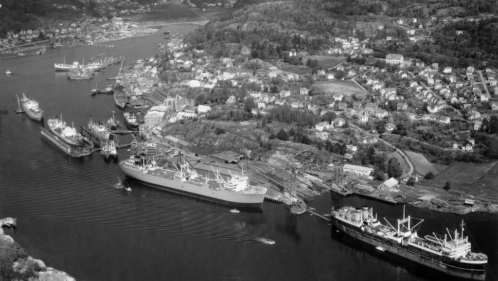 Slutten av 1940-tallet. Framnæs-fergen under veis. Øverst til venstre flytekranen Goliath i arbeid (havarerte vest for Helgeroa i 1949). Kosmos V og "Rossen".