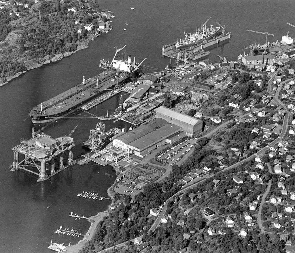 1979? Nederst til venstre H-3-riggen Treasure Finder med 2 helikopterdekk. Langs dypvannskaien stort tankskip, der flytekranen Arnt leverer en last. Innenfor seilskipet "Christian Radich" og i stordokken...?