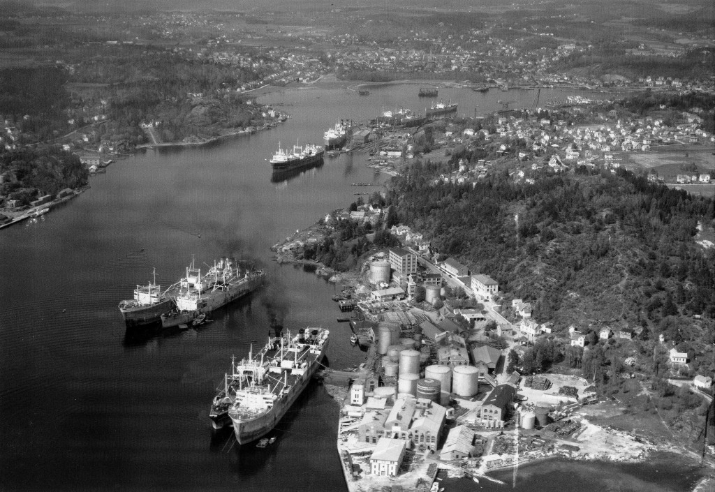 Usedvanlig mange hvalkokerier. Pga. flytekranen Goliath i bakgrunnen før august 1949. Thor Dahl kokerier ved Gonvika (før anlegg på Thorøya?).