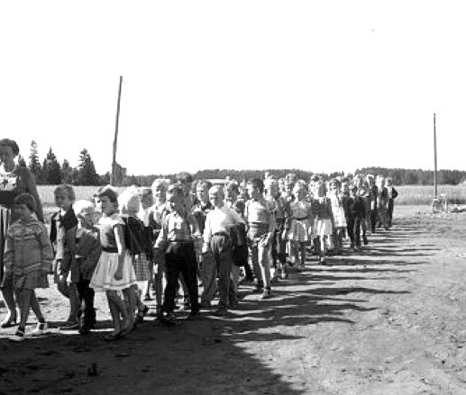Skolebarn på vei inn på den nye skolen, da den ble tatt i bruk i 1958.