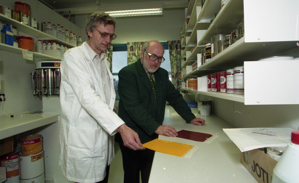 Kjemiingeniør Sigve Fjelde og teknologidirektør Cristian Brevik ser på impregnerte prøver