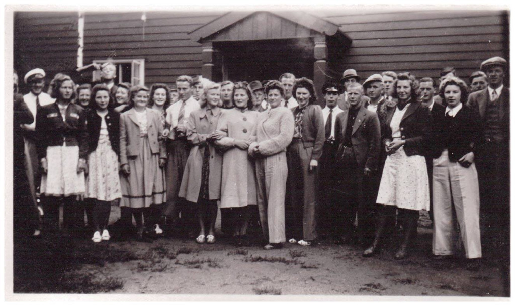 Fra venstre: ukjent mann, Else Torp Haugan, Gunlaug Kjærås, Magnhild Taranrød, Erik Sparre Moen (bakenfor), Liv Hynne, Therese Haugberg, Karen Johanne Skjelland, ukjent mann bak, Ragnar Bakkeland, Arne Taranrød, ukjent dame, Åsta Haugberg, Ambjørg Skjelland, Kristian Hotvedt, Synnøve Gravdal, Harald Skjelland Holt, Gerd Kolkinn, ukjent mann m/ skyggelue, Lars Hanedalen (m/hatt bakenfor), ukjent mann m/mørk skjorte, Kristen Haugberg (m/lys skyggelue), bakenfor Oddmund Kjærås, Hjørdis Hynne Tolsrød, ukjent mann m/sigarett, Oddmund Slettingdalen (delvis skjult), foran han Ingjerd Ellefsrød, bakenfor Lars Haugberg, Kjærås, Leif Kolkinn