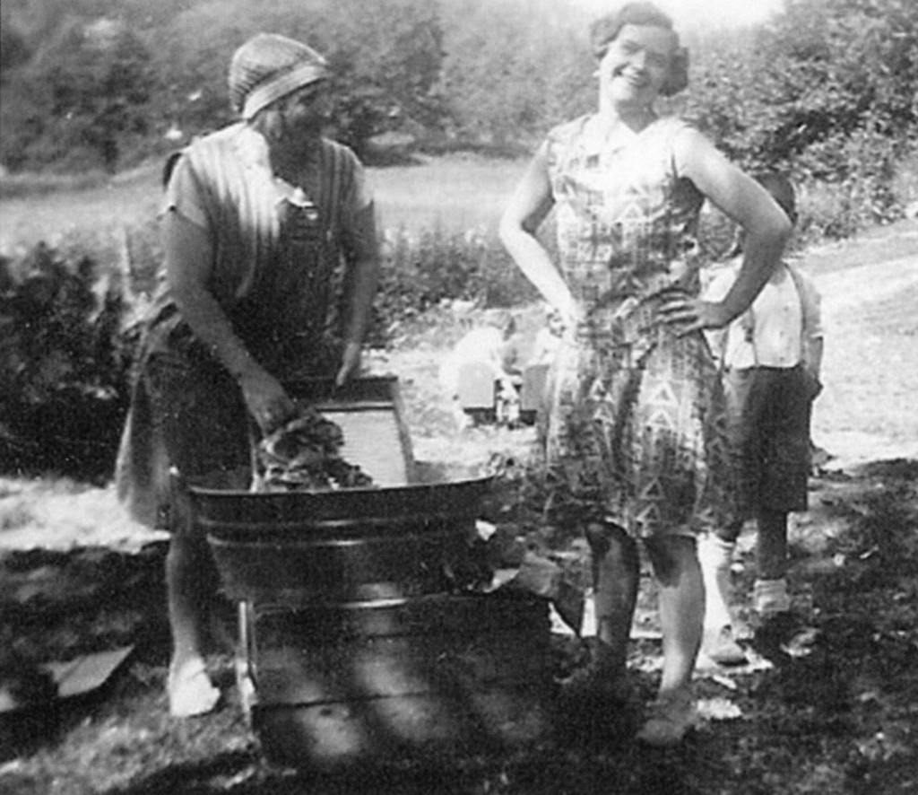 Helga og Liv Gade vasker klær ved olla ca. 1930.