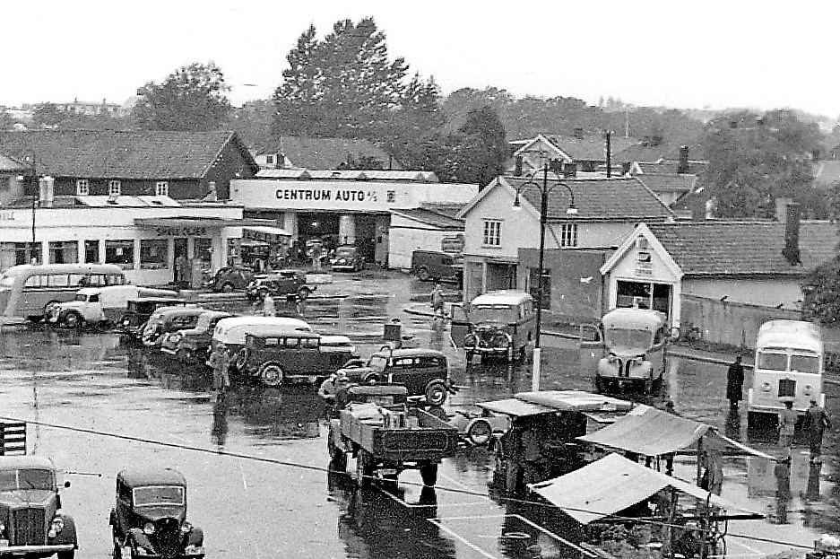 Bildet er fra ca 1950 og viser stor aktivitet både hos Centrum Auto og på Aagaards plass.
